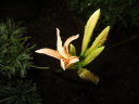 小雨降る明け方に開きはじめました。薄く朱色がかっていますが白花です。