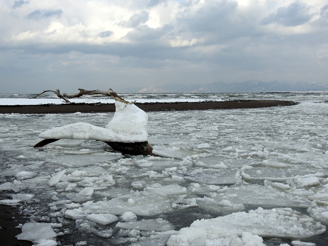 河口での遭遇のページで砂嘴先端が伸びていることに触れましたが,昨日(12/23),先端がさらに伸びていることを確認しました。モンスター流木との位置関係からも分かります。また,流氷が押し寄せて,景観が激変していました。