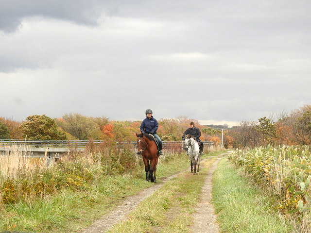 ここでもクマが怖いのでスズをぶら下げていたが,堤防上の帰り道ではウマに遭遇した。