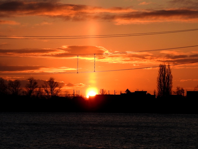 12/08 (7:06)ところで昨日12/8は絶好の朝陽日和でもありました。でも,ここんとこ紅葉山公園と茨戸川で合わせて4回も行って草臥れたのでパス。なのに月を撮るのに二階の窓から覗くと,なんとまたまたくっきり太陽柱。厳寒の現象とされていますが,アメダスではプラス0.5℃くらい。不思議です。