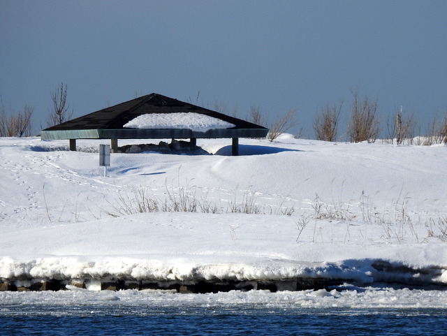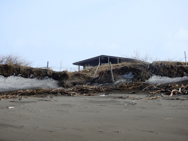あずまや昨日(3/22)の砂嘴先端。またまた崖下歩行まるで能わず。3/10版に倣って,歩いて進行方向の(a)と,振り返って見た方向(b)で示す。3/9にはかろうじて崖の上にあったモンスター流木がこの日は完全に海の中。浸食されて崖が10mほども後退したのだ。 ついでに,のんびりとあずまや。周囲の雪はかなり解けて嵩が下がったが,なぜかあずまやの中に積もった雪はまだ山のよう。