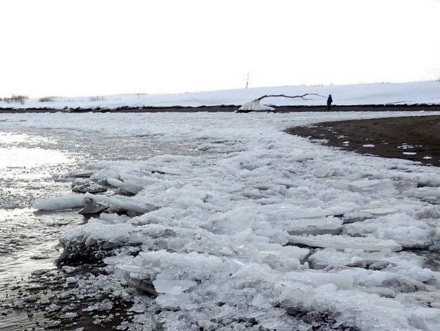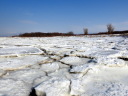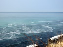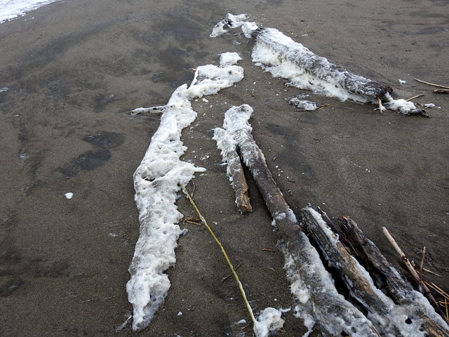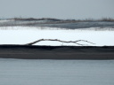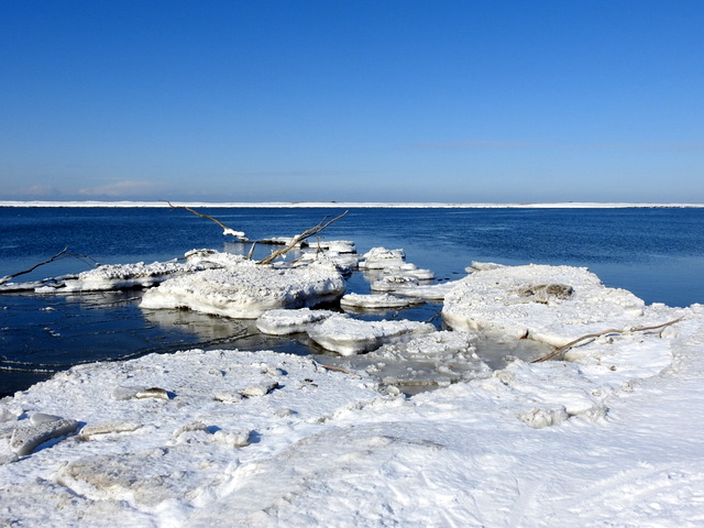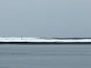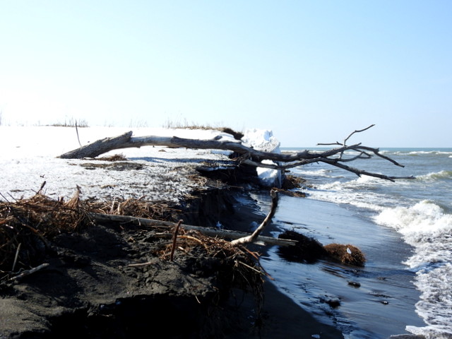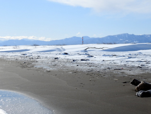 おそらく年末からの強い寒さで流氷とともに海水が凍結,その縁の部分に沿って砂が堆積したに違いない。やがて春になって凍結が解除したら,中央部には大きな中海が出現するかもしれない。