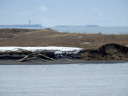今日の狙いは,対岸砂嘴先端のモンスター流木。3/9の時点より崖の浸食は明らかに進んで,モンスターの根元まで露わになっている。が,なんとか持ちこたえている様子(b)。