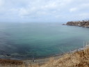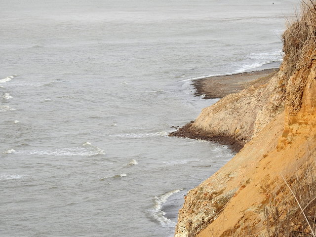 前回(2/20)と同じく,砂嘴先端の100mほどが崩落,波に洗われていて崖下の歩行は不能だった。先端がどんどん押しつぶされていて,歩行不能箇所はかなり異なるのだが。先端を左回りに歩いて,それぞれ,(a) は進行方向の様子,(b) は通り過ぎて振り返って見た様子。さすがの私も崖の上に逃れた。
