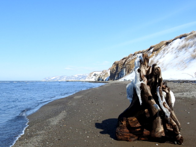 モンスター流木昨日(3/9)快晴,浜歩き日和。3/6,知津狩河口からは定かに見えなかったモンスター流木の安否確認に訪れる。