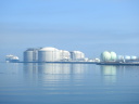 (b) 石狩湾新港・樽川埠頭から,中央埠頭のLNGタンク群を望む。