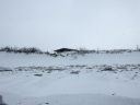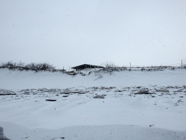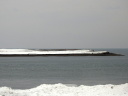 (b) 砂嘴先端のモンスター。波打際から50m以上離れて波をかぶることもなく,雪原にひっそりとしたたたずまい。