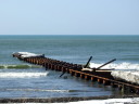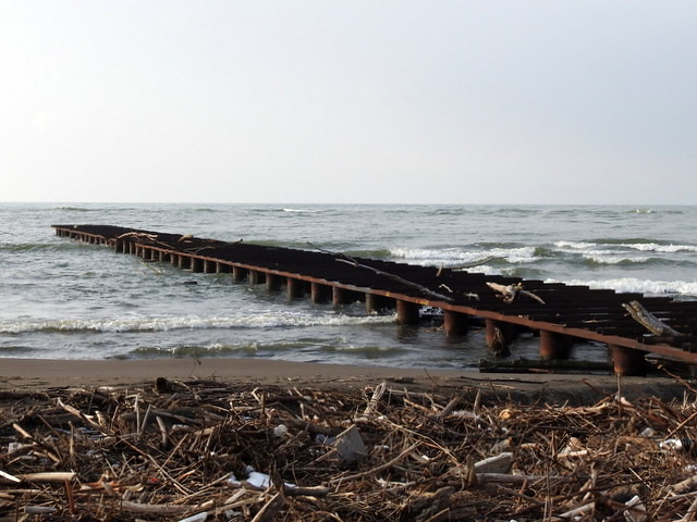 (a) 第一号水制先端の流木越しに石狩灯台を望む。おりしも干潮時だったのだが,気圧の押し下げがなくて水制はほとんど水没していた。