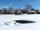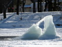 岸辺から循環放水へと,結氷した池の上を辿る足跡が残されていたので近づいてたみた。モンスターをそのままにしておいたら,結氷が進んで開氷部が消滅してしまう虞があるので公園管理者がモンスターを打ち砕いたに違いない,というのが私の推理。
