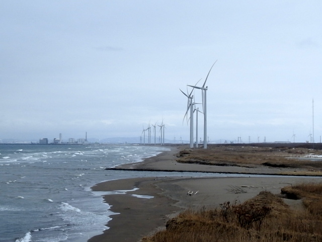 影も形もないものと思っていた残り1基の橋脚が平気な顔してそのまま残っていた(b)。つまるところ,工事はまったく進んでいなかったということ。これでやめてしまうというのならそれでもいいのだが・・・浜辺を歩いているうちに次第に西風が強まり,新港方向を望むいつもの銭函砂丘高台では激しい砂つぶて(c)。