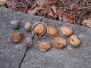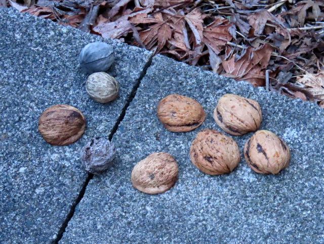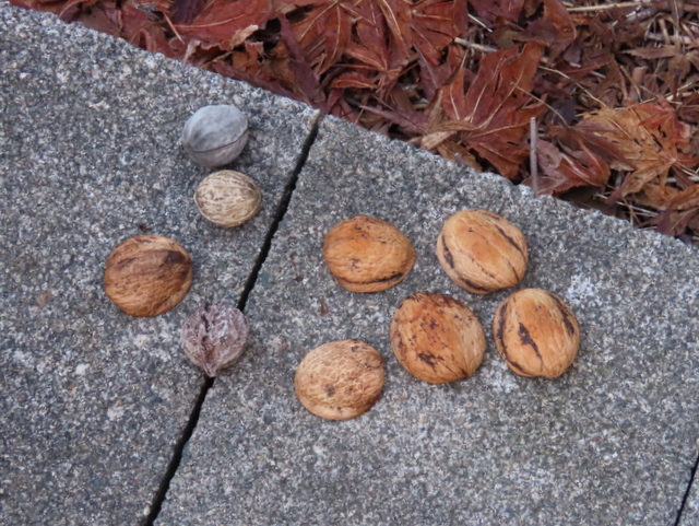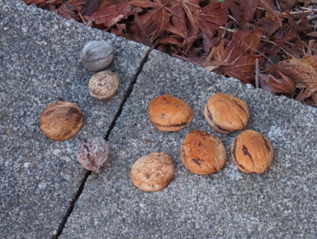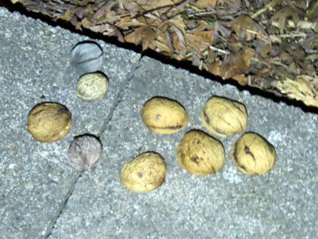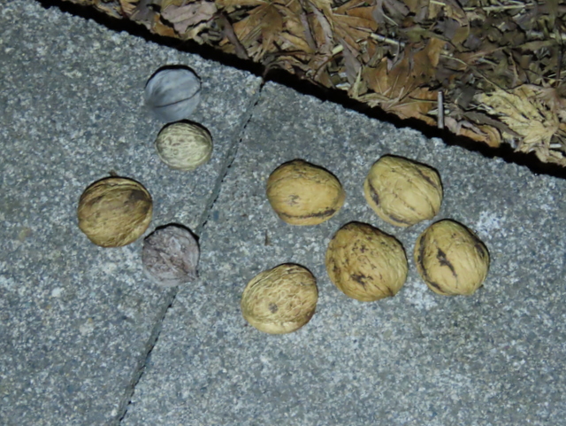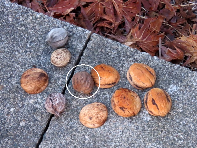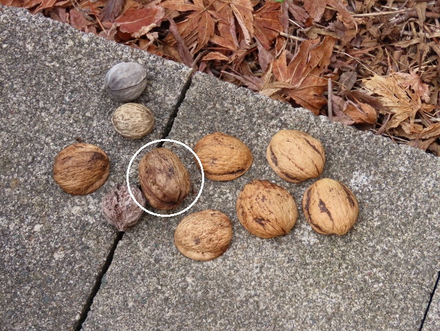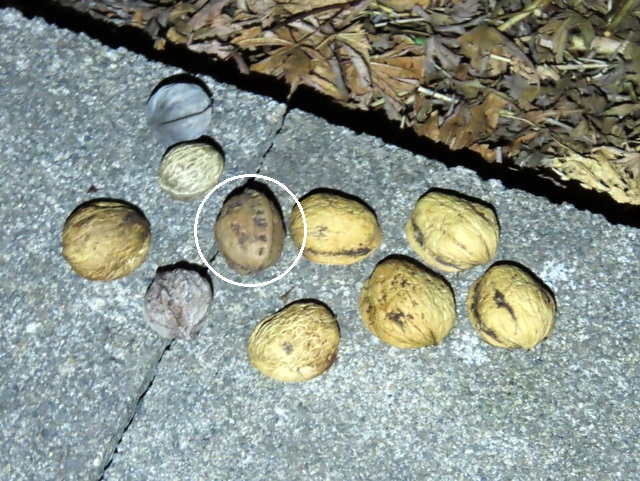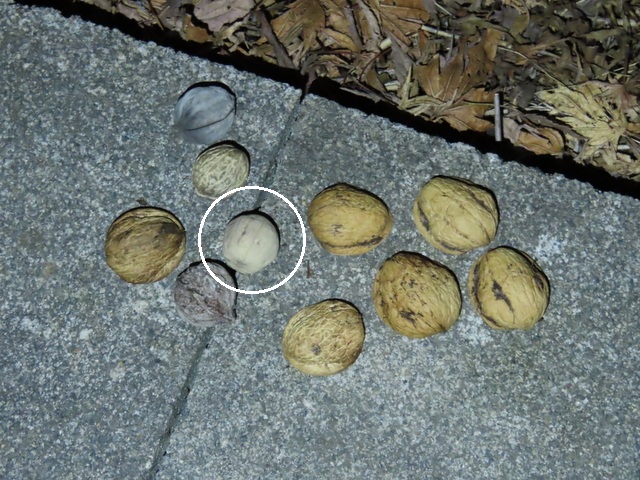 ヒガンバナ開花の項で多忙と書いたにもかかわらず,お爺さんとしては犯人を突き止めたい。犯人が無視している9ヶに,1ヶだけまともなクルミ(画像中の〇印)を混入して放置してみることにした。