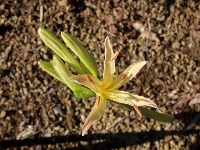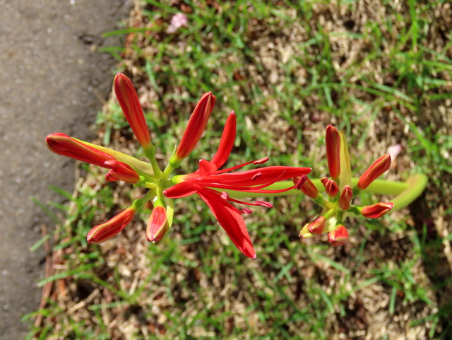 (c,d)はひとつの株(球根)から揃って伸びてきた花茎で,9/19版の(c)の画像をよく見るとちっちゃい花芽が頭を覗かせていることが分かります。それが(d)です。先に咲いたのは(c)で(a)と同じ9/27でした。