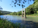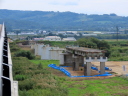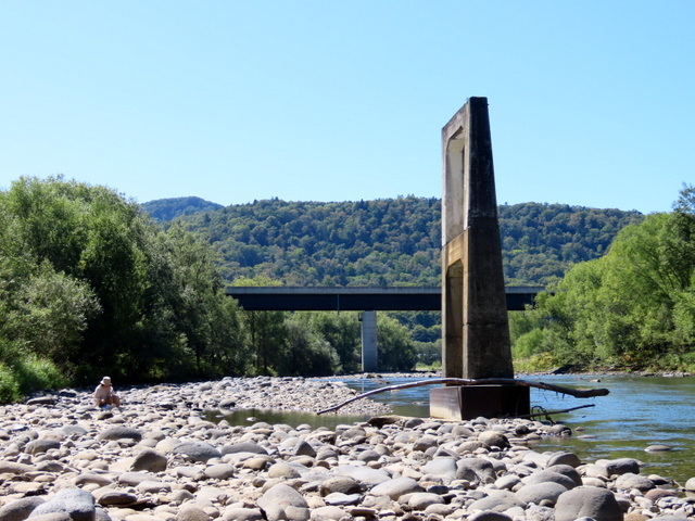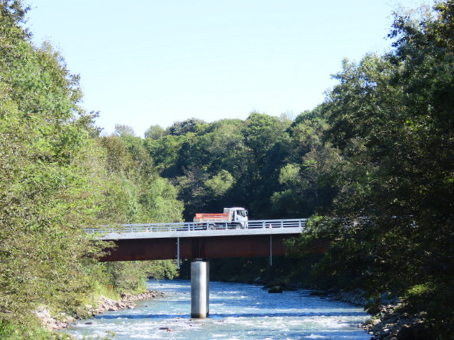 (C) 七戸の吊橋。吊橋が崩落して9年。よほどの物好きでないと訪れる人もいないかもしれない,しかしわたし(たち)には,道の駅かコンビニで買った弁当をここの河原でゆったりと食するのが至福のひと時。(-1)は昨年9/9。実に至福。しかし(-2)は今年9/15。前日来の大雨で増水。河原で弁当,どころの騒ぎではなかった。