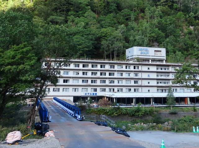 (G) 彩雲橋。国道39号と廃業したホテル層雲本館とを結ぶ町道に架かる橋。(-1)昨年9/9にはホテル層雲はしっかりその姿を留めていたが,(-2)今年9/13にはホテルはもはやない。一度は泊まったことがあるだけに,なにかしら寂しい。(-3)橋を渡っているのはシカ4頭。(-4)そして翌々日の9/15,再度通りがかると工事のために補強されたと思われる高欄の下流側が撤去されてなくなっていた。もしかしたら彩雲橋そのものもまるごと撤去されてなくなってしまうのかもしれない。