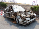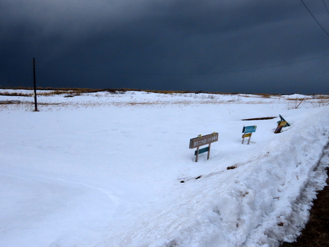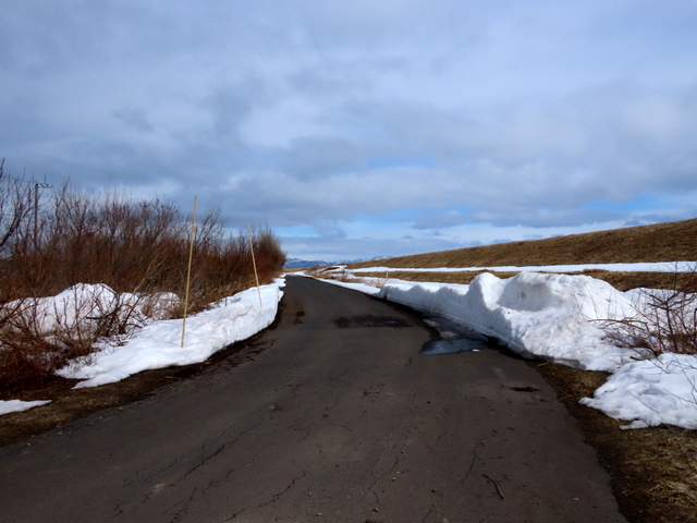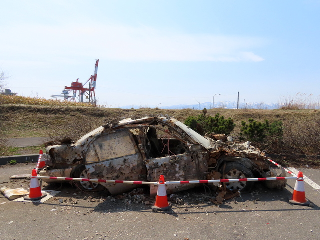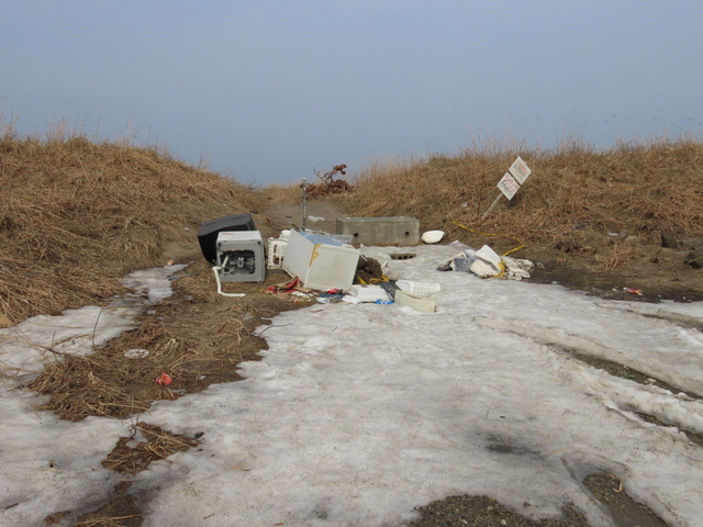 (b) 三線からあそびーちに繋がる海岸通りがようやく走れそう。入って間もなくの放置車。昨年12/6には雪の中で確かにあったのだが,すでに撤去されていた。一緒に捨てられていた冷蔵庫などはそのまま。