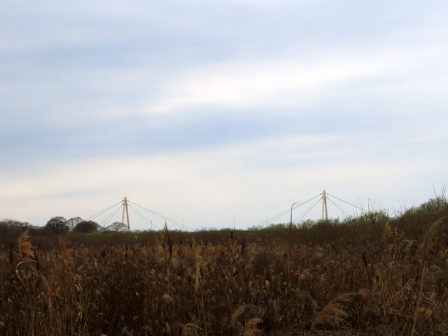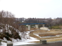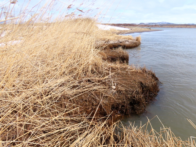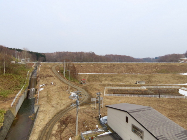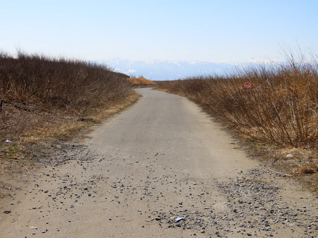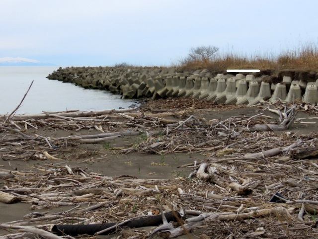 (d) 浜歩きを断念してまわった右岸。八幡堤防から知津狩に通じる市道は勝手に開通していた。知津狩新橋を渡ってすぐのゲートからのアプローチ。昨年(2025/4/1)は雪解け水が深さ50センチ以上溜まって海状態。とても歩けなかったのだが,今年はほとんど乾いている。昨年8月以来,向かって右一帯が残土の置き場と化したせいなのか,そもそも雪が少なかったせいなのか,定かではない。