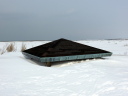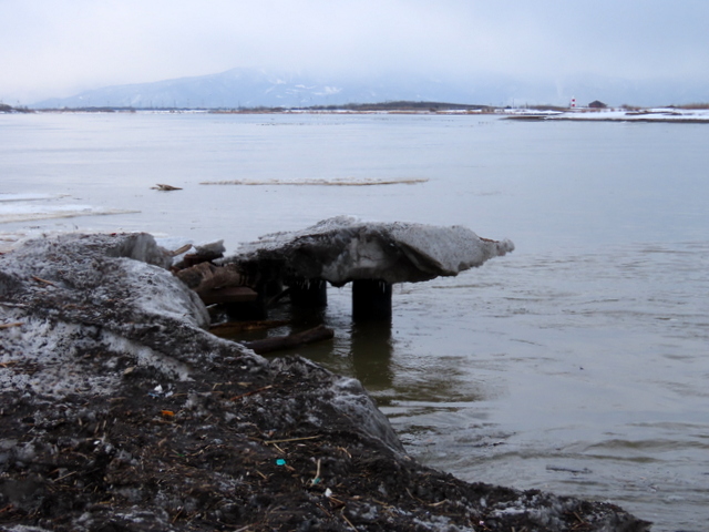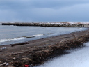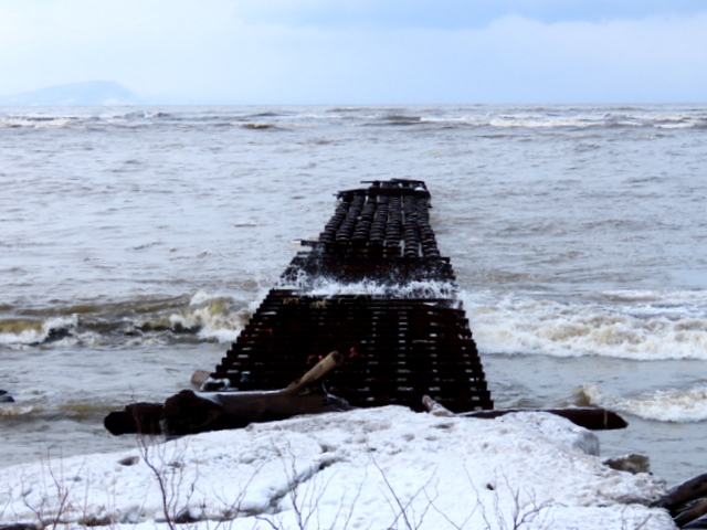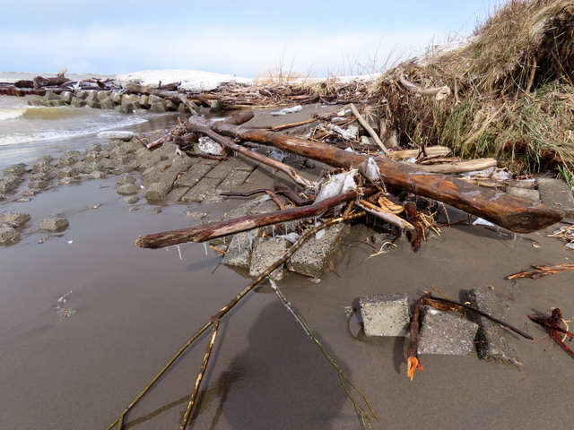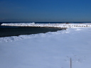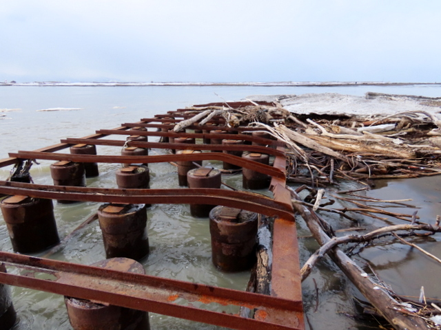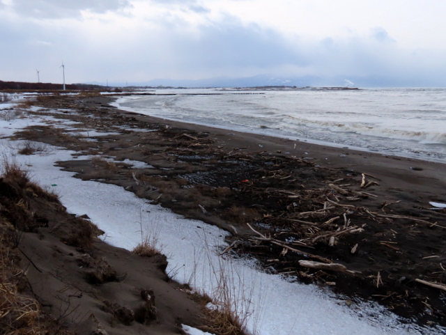 1/29には石狩川の川岸(浜)は全面雪氷に覆われていたが,2/24では奥まった浜崖の近辺にのみ僅かに残雪がある程度で地表の砂がほとんど露出していた。雪氷が解けたり流されたりした分だけ,汀線が後退しているように見える。実際にも2/19未明の有義波高6m(ナウファス・石狩湾新港)に及ぶ大時化で侵食されたのかもしれない。