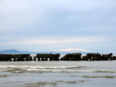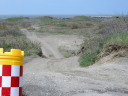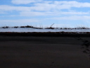 (e) 途中遥かに望むと,河口導流堤近辺には見える限り8台の車両。みんなこのけもの道を通って入ったのに違いない。そして導流堤の上には釣り人がたくさん。いまではとても考えられない。