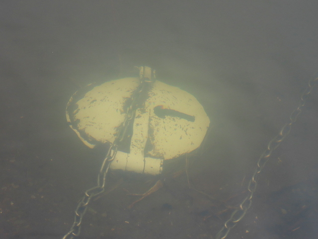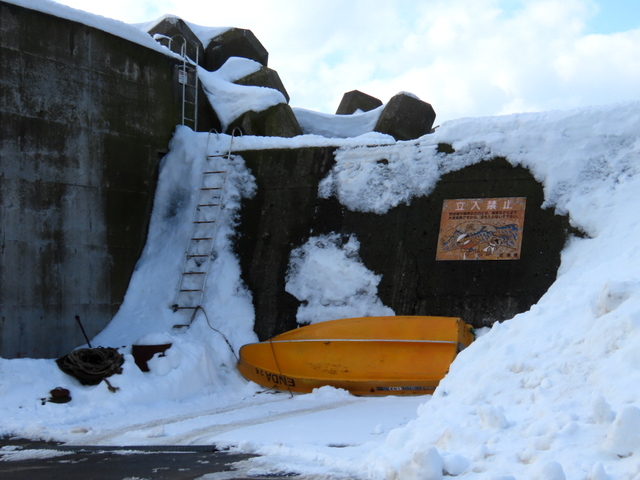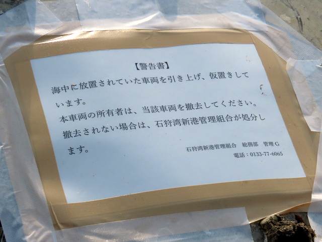 (a) 出かけて間もなくの花畔埠頭駐車場隅に異物。いったん通り過ぎてUターン。ナニコレ?「警告書」が貼り付けられている。海底に沈んでいたのね。貝がたくさん付着している。