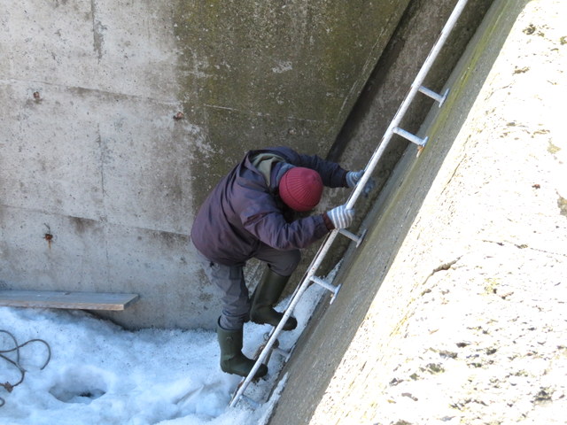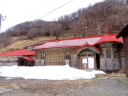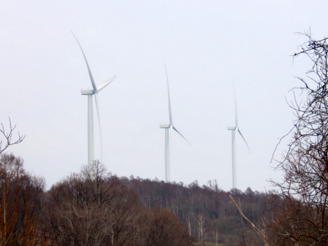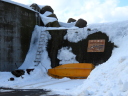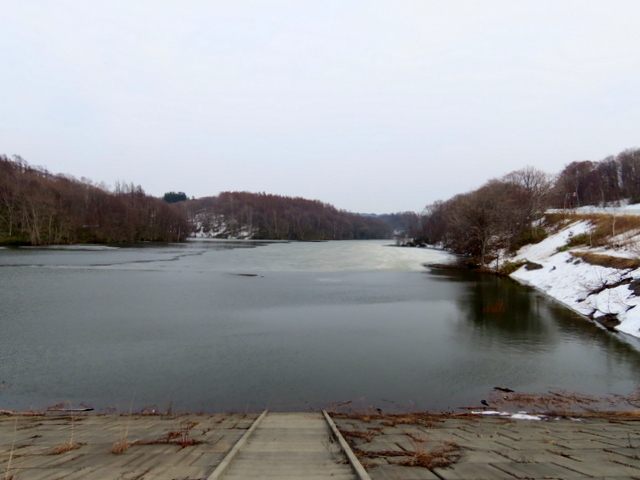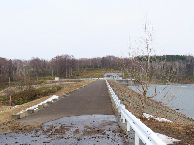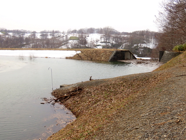 (f) (-1)五の沢林道入口のゲート。林道はまだ雪が深い。八の沢の5基の風車のうちの3基。(-2)五の沢ダム。手前を除いて池の表面はほとんど凍っている。一番上の取水口も閉じられたままなので満水状態。(-3)溢れた水が洪水吐から流れ落ちている。