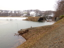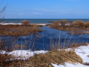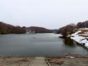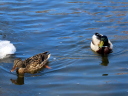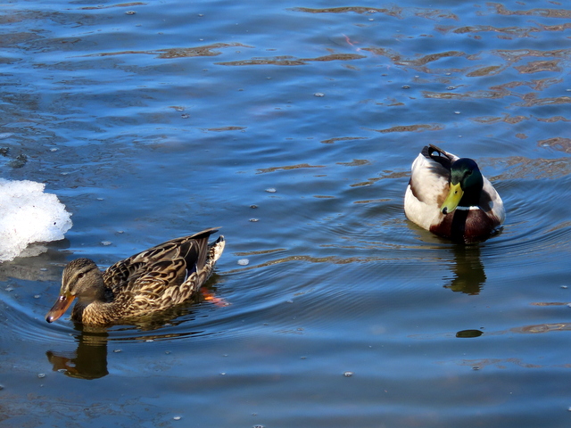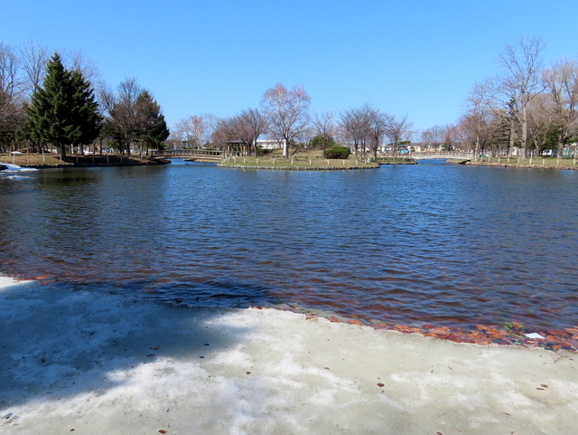 そしてその5日後の今日(4/1),岸辺のごく一部を残し青い水面に覆われていた。マガモのつがいも戻ってきていた。春です。