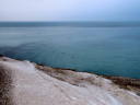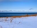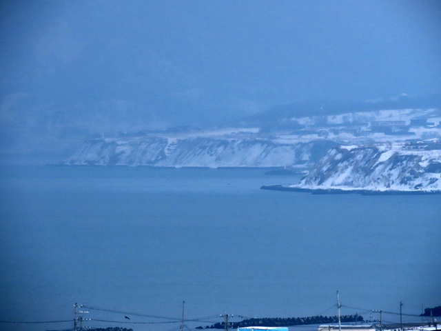 海食崖の上の道の行き止まりから石狩方向を望む。石狩川河口導流堤の先に白濁が伸びている。通常こちら側には群来は発生しないので,潮流と光と陰のいたずらなのだろう。しかし諦めない。さらに厚田方向へと走る。