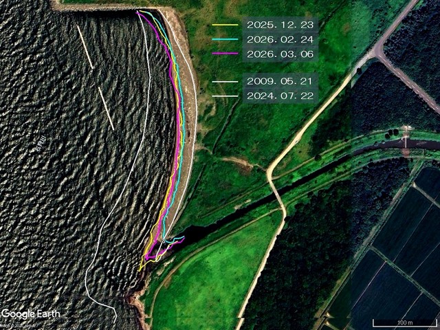 2/24と3/6に歩いた汀線軌跡を Google Earth に落としたのが(l)。本来なら今年最初の1/29の軌跡も示したかったのだが,この日は波打ち際まで雪氷が厚く迫り出していて,お爺さんでもコワくてとても歩けず,軌跡を取得できなかった。ので,昨年最後の12/23の汀線軌跡を加えた。