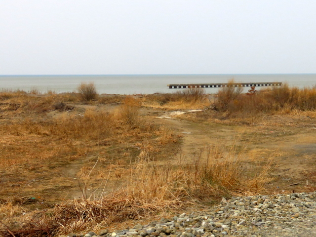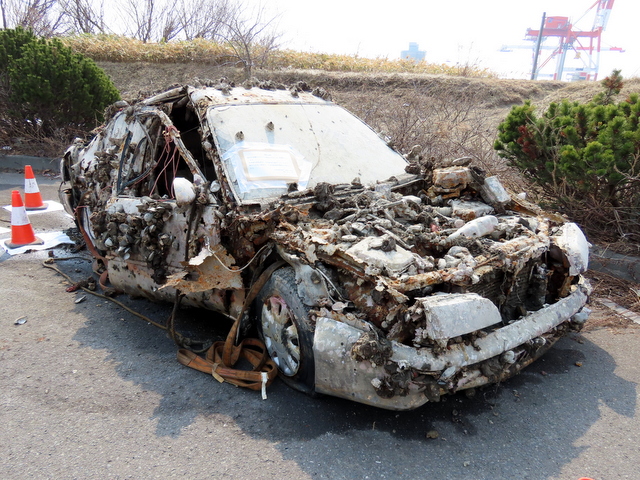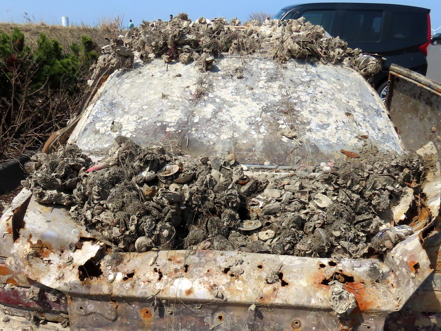 f (4/16)(a) 3/31b版に登場した海底に沈んでいたとされる車。4/9のありようです。後ろから見るとこんな案配。貝が山盛りに付着していますが,不思議にもガラスにはくっつかないのですね。もしかしたらこそぎ落としたのかしらん?確かめるべく,その次に花畔埠頭に通りがかったのは4/16。忽然と姿を消していました。