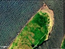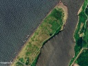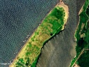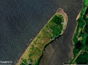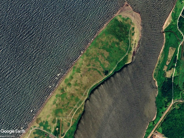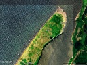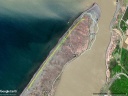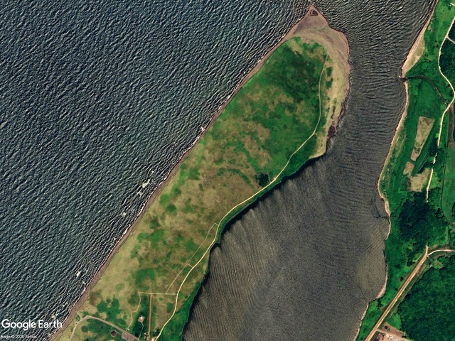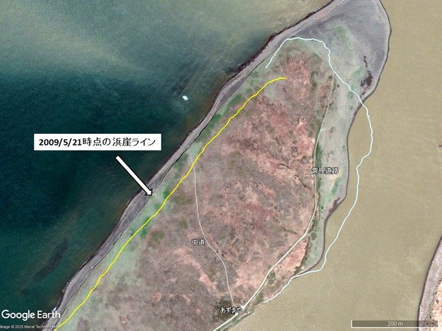 C 2009/5/21 取得の Google Earth 背景画像(過去画像から取得)。およそ16年前の砂嘴先端の形状を彷彿とさせられる。現在は先端と海側が大きく浸食されて,川側に川幅を狭めるようにやや堆積が進んでいる様子が確認できる。
