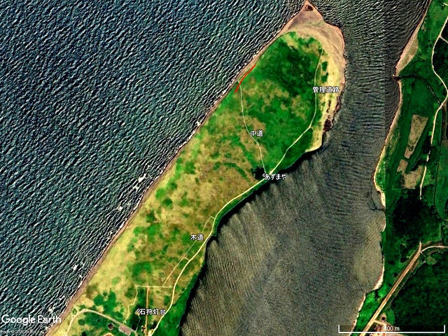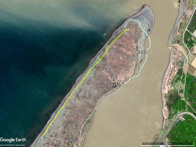 実はお爺さんが生まれて初めてほぼこの道を導流堤まで歩いて往復したのが2009年5月10日。奇しくも上の Google Earth 画像取得日とほとんど変わりませんから,(A)の車道軌跡をほぼ辿ったことになります。17年前ですから,まだ血気盛んな60代半ば。いやそういう話ではなくて,先ほど地震があって津波が押し寄せる,とか。