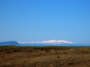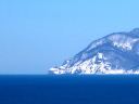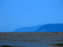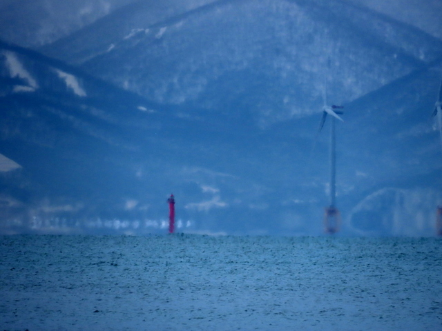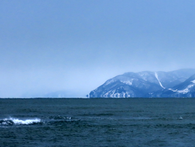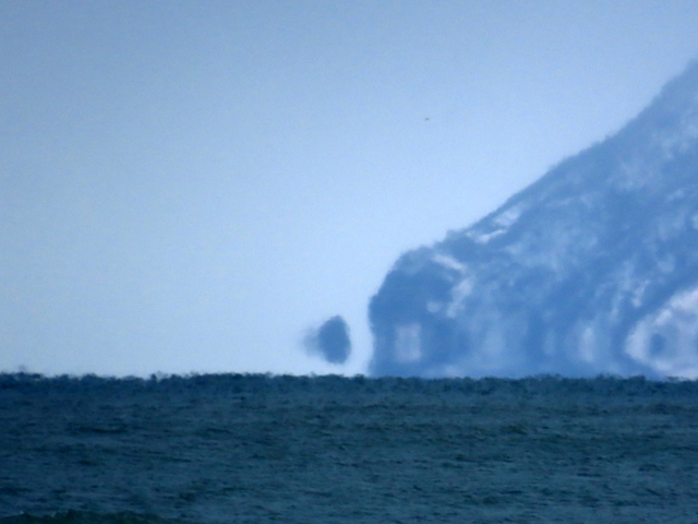 砂嘴先端から北を望むと,手前に愛冠岬,その向こうに雄冬岬(2025.07.23の画像)。今日は雄冬岬は霞んでほとんど見えないが,手前の愛冠岬の先端の鷲岩が浮かんでいる。極寒での下位蜃気楼,浮島現象だ。