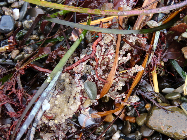 浜に打ち上げられた海藻にはニシンの魚卵がびっしり(b)。