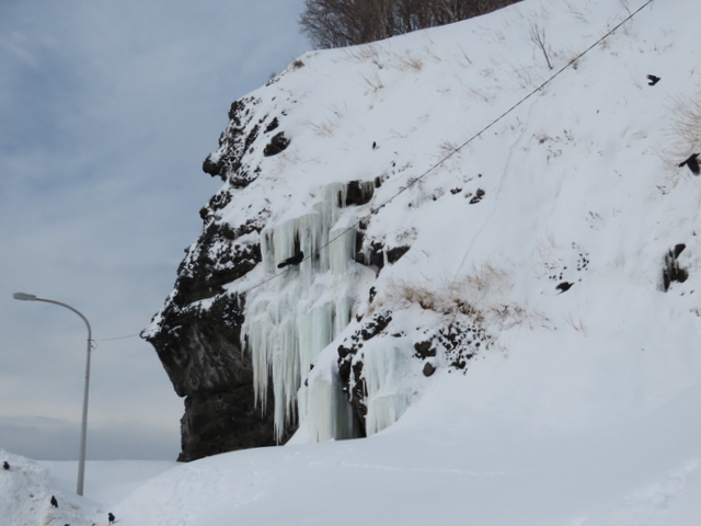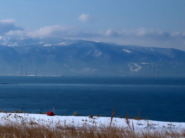 いつもながらの望来VP(ビューポイント)から眺める。白っぽい。けど,確信はもてず。雪山から降りるとき滑ってコケる。