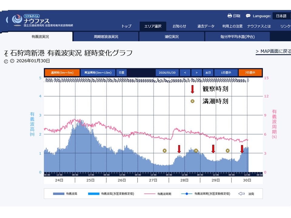 別狩夕べ(1/27)は20時ころ満潮。このところずっと荒れ気味だった石狩の波浪状況はここにきて思いのほか平穏。ニシンたちは満潮時に産卵のため浅瀬に押し寄せる。そして今朝(1/28),風なく穏やか。今でしょっ!7時半ころ飛び出して走る。