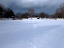 (d,e) まったく関係なく,1/16の紅葉山公園。南池の南端から中島を望む。たかだか18分しか違わないのに,(e)では(d)にはない何者かの足跡が残されていた。大汗をかいた。