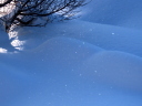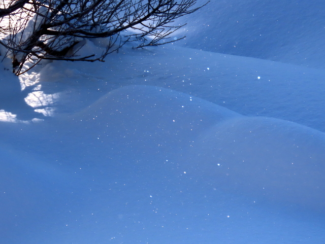 それはそうと,そのほぼ1時間半後の8:25。黒雲は去ったけれどまだ高くない朝陽を見上げる角度と,ほぼ同じくらいの角度で見下ろす(2階の窓からだ)と,なにやらキラキラとごく小さな欠片が輝く(c)。細氷に違いない。儚くも美しい。