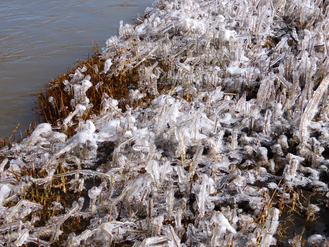 (c) 途中で堤防から下りて川岸へ。波しぶきが凍り付いた枯葦の造形。
