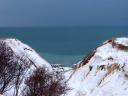 望来海食崖の上からの石狩川河口導流堤の先。ここだけは白い筋が伸びている。