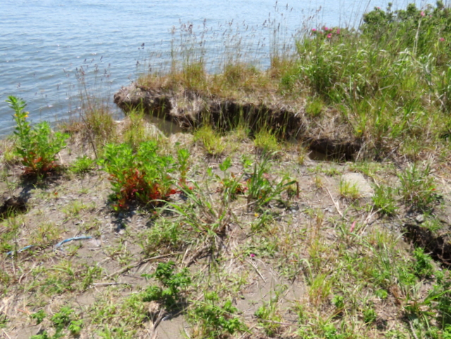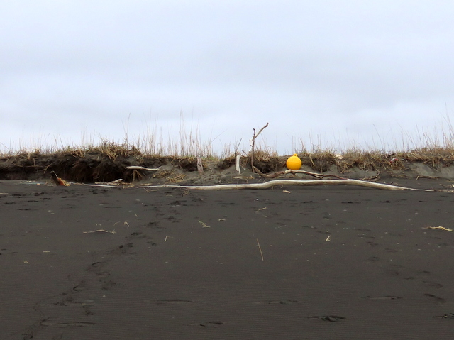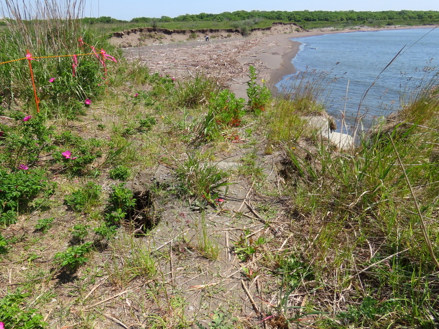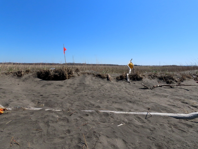 D3/21版でも触れたが。昨秋以降砂嘴先端の浜崖は侵食され,広範囲にわたって崩落後退した。とりわけ中道の突き当り近辺(特にその南側)およそ300mほどにわたって,最大で20mほども崖位置が後退したものと思われる。