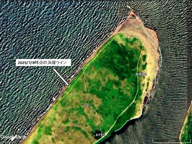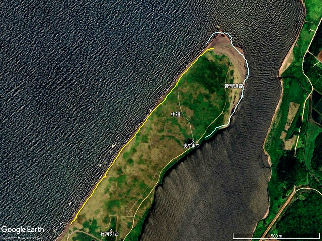 というわけでこれからも左岸砂嘴海側浜崖の烈しい侵食などを考察するうえで,Google Earth 背景画像の補正が不可欠となるだろう。それにしても,酷い嵐だ。