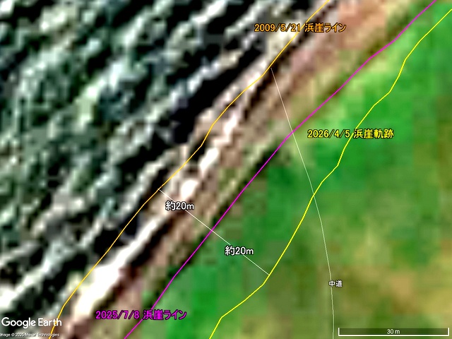 2009年 ⇒ 2025年 ⇒ 2026年 の間に大きいところでそれぞれおよそ20mほど浜崖が後退していることを知ることができる。今回,昨秋以降の後退は2008年ころからこの辺りの定点観察を始めて以来,間違いなく最大クラスのものだったといえるだろう。
