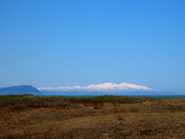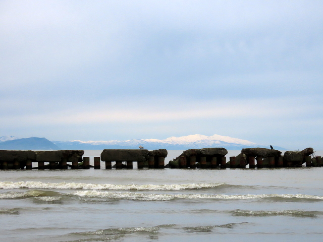 (b,c) 4/15には右岸を,4/16には左岸をうろつきました。4/15は曇天,4/16は晴天でしたが,どちらも見通しがよく遠景がくっきり。両日の積丹半島です。4/15は右岸河口導流堤を近景として。4/16は左岸はまなすの丘の川沿いの高台から望みました。