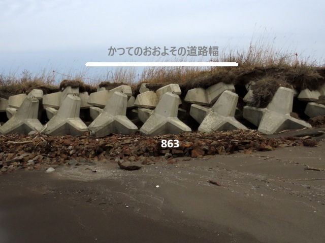 今でもこの道路があるとしたら,導流堤(A図の上方)から走ってきた車は,第二突堤上の陥没をすり抜けたとしても突堤から砂浜か海中に大きくダイブする,ということになりますね。